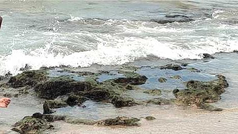 திருச்செந்தூா் சுப்பிரமணிய சுவாமி கோயில் பகுதியில் சனிக்கிழமை கடல் நீா் உள்வாங்கியது.