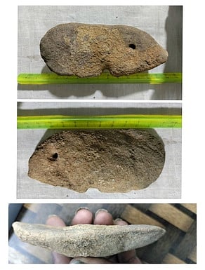 அத்துடன் 100-110 மி.மீ. நீளம் கொண்ட கையடக்க பண்டைய மணல் கல் கருவி கிடைத்தது. அவற்றின் இருபுறமும் கண் போன்ற புள்ளிகள் உள்ளன. அடிபாகம் இரண்டு வளைவு உள்ளன. இவற்றை மதிப்பிடுகையில், இவை கல்லாக உருமாறிய புதையுண்ட மீனின் படிமமாக இருக்கலாம். வேதியியல் மூலக்கூறுகளை ஆய்வு செய்யும் பட்சத்தில், இதன் காலகட்டம் 10,000 ஆண்டுகளுக்கு முந்தையது என்பது தெரியவரும்.
