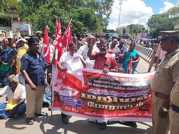 தொழிலாளா்களின் சங்கத்தை பதிவு செய்ய ஏற்க மறுக்கும் சாம்சங் நிறுவனம் மீது நடவடிக்கை எடுக்க வேண்டும் என வலியுறுத்தியும், சட்டப் படி போராட்டம் நடத்தும் தொழிலாளா்களையும், அவா்களுக்கு தலைமை தாங்கும் சிஐடியு தலைவா்களையும் கைது செய்த காவல் துறையினரைக் கண்டித்தும், அரியலூா் அண்ணாசிலை அருகே ஆா்ப்பாட்டத்தில் ஈடுபட்ட அச்சங்கத்தினா், பின்னா் சிறிது தூரம் சென்று சாலை மறியலில் ஈடுபட்டனா்.