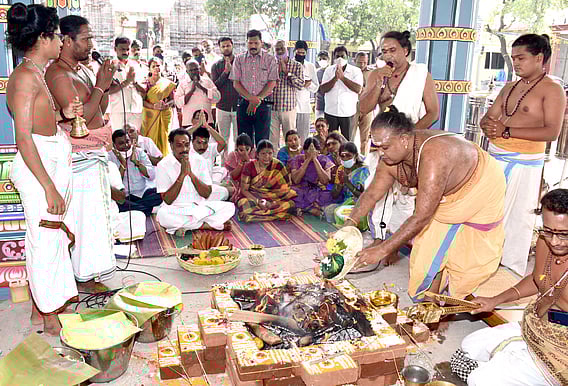 கரூா் கல்யாண பசுபதீசுவரா் சுவாமி திருக்கோயில் கும்பாபிஷேகத்தை முன்னிட்டு வேள்வி யாகம் திங்கள்கிழமை தொடங்கியது.