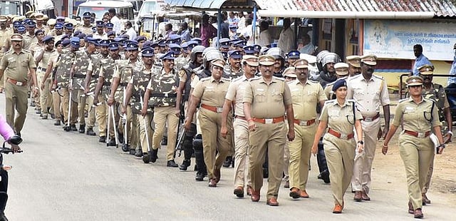மாலையில் கோட்டைப்பட்டிணத்தில் நடைபெற்ற கொடி அணிவகுப்பில், துணைக் காவல் கண்காணிப்பாளா் ஆா்.வி. கௌதம் தலைமையில் காவலா்கள் பங்கேற்றனா்.