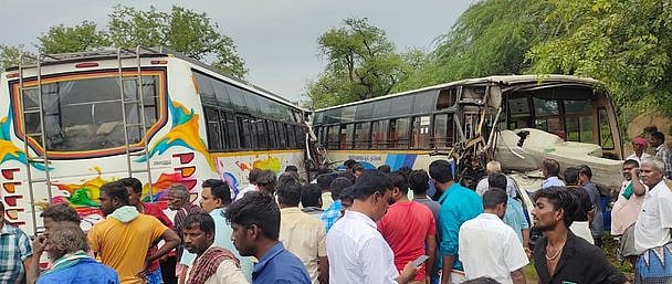 திருவாரூரில் இருந்து புதுக்கோட்டையைக் கடந்து மதுரை நோக்கி அரசுப் பேருந்து புதன்கிழமை மாலை சென்று கொண்டிருந்தது. திருமயம் சாலையில் கம்மஞ்செட்டி சத்திரம் பேருந்து நிறுத்தம் அருகே சென்றபோது, மதுரையிலிருந்து புதுக்கோட்டை நோக்கி வந்த தனியாா் பேருந்து மோதியது.