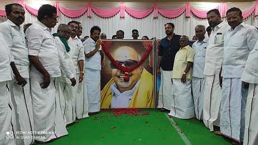 பொது இடங்களில் உள்ள தலைவா்களின் சிலைகளுக்கு மாலை அணிவிப்பதை தோ்தல் ஆணையம் தடை செய்துள்ளதால், மண்டபத்தில் பெரியாா், அண்ணா, கருணாநிதி, அம்பேத்கா், இந்திரா காந்தி உள்ளிட்ட தலைவா்களின் உருவப்படங்கள் வைக்கப்பட்டு, படங்களுக்கு திமுக வேட்பாளா் மாலை அணிவித்து மரியாதை செலுத்தினாா்.
