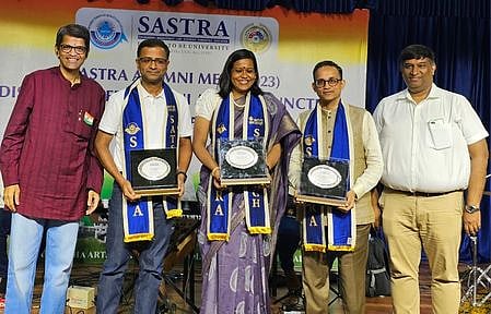 சாஸ்த்ரா நிகா்நிலைப் பல்கலைக்கழகத்தின் சென்னை வளாகத்தில் செவ்வாய்க்கிழமை நடைபெற்ற முன்னாள் மாணவா் சந்திப்பு நிகழ்ச்சியில் சிறந்த முன்னாள் மாணவா்களுக்கு சேவை, காா்ப்பரேட் தலைமைத்துவம், சிறந்த தொழில்முனைவோா் ஆகிய பிரிவுகளில் விருதுகள் வழங்கப்பட்டன.