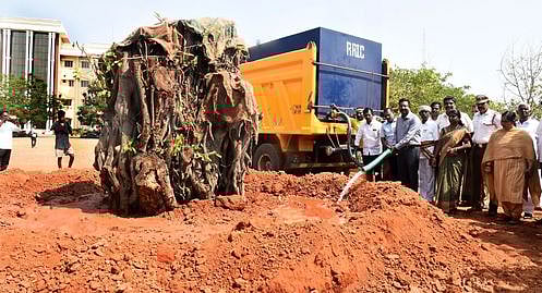 தஞ்சாவூரில் சாலை விரிவாக்கத்தின்போது அகற்றப்பட்ட ஆல மரம் மாவட்ட ஆட்சியரகத்தில் வியாழக்கிழமை நடப்பட்டது.