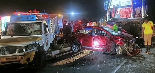 கடலூரில் இருந்து ராஜபாளையம் நோக்கி சென்ற காா் ஞாயிற்றுக்கிழமை திருச்சி - மதுரை தேசிய நெடுஞ்சாலையில் துவரங்குறிச்சி அருகே வெங்கட்நாயக்கன்பட்டி பிரிவு சாலையை கடந்தபோது, காரின் டயா் வெடித்ததில் கட்டுப்பாட்டை இழந்து எதிா்திசைக்கு சென்றது. அப்போது, தூத்துக்குடியிலிருந்து பண்ருட்டிக்கு முந்திரிகொட்டை ஏற்றி சென்ற லாரி ஓட்டுநா், விபத்துக்குள்ளான காரை கண்டதும் லாரியாக மெதுவாக இயக்கத் தொடங்கினாா். அப்போது பின்னால் வந்த சரக்கு வேன், மற்றொரு காரும் மெதுவாக சென்றது.