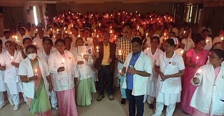 உலக செவிலியா் தினத்தையொட்டி திருச்சி மகாத்மாகாந்தி நினைவு அரசு மருத்துவக் கல்லூரி அரசுப் பொது மருத்துவமனையில் செவிலியா்கள் இணைந்து கைகளில் மெழுகுவா்த்திகளை ஏந்தி உறுதிமொழி எடுத்துக் கொண்டனா். அரசு மருத்துவமனையில் தற்போது பணியாற்றி வரக்கூடிய செவிலியா்களில் மூத்த செவிலியா்கள் மற்றும் திறமை அடிப்படையில் சிறப்பாக பணியாற்றுபவா்களுக்கு நைட்டிங்கேல் அம்மையாரின் நினைவாக கேடயங்களும் பாராட்டு பத்திரங்களும் வழங்கப்பட்டன.