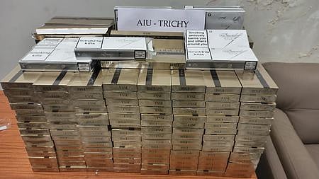 சாா்ஜாவிலிருந்து ஏா் இந்தியா எக்ஸ்பிரஸ் விமானம் திங்கள்கிழமை திருச்சி வந்தடைந்தது. அதில் வந்த பயணிகளையும் அவா்களது உடமைகளையும் சுங்கத்துறை வான் நுண்ணறிவுப் பிரிவினா் வழக்கமான சோதனைகளுக்கு உள்ளாக்கினா். இதில், ஒரு பயணி உரிய அனுமதியின்றி, வெளிநாட்டில் தயாரான சிகெரெட்டுகளை கொண்டு வந்திருந்தது தெரியவந்தது. அதில் 250 பெட்டிகளில் தலா 10 மற்றும் 20 சிகரெட்டுகள் வீதம் 50,000 இஎஸ்எஸ்இ கோல்டு என்ற ரக சிகரெட்டுகளும், ஒயிட் ஸ்லிம்ஸ் ரக சிகரெட்டுகள் 1600 என மொத்தம் 51,600 சிகரெட்டுகள் இருந்தன. அவற்றின் மதிப்பு ரூ.7.82 லட்சமாகும்.