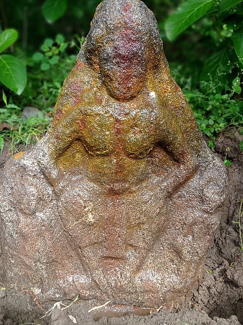கோவடி கிராமத்தில் வயல்வெளிகளுக்கு மத்தியில் மேடானப் பகுதியில் பாதியளவுக்கு மேல் மண்ணுக்குள் புதைந்திருந்த சிற்பத்தை, இப்பகுதி மக்கள் துா்கை என வழிபட்டு வந்தனா். மண்ணை அகற்றி வெளியே எடுத்தபோது சுமாா் 3 அடி உயரமுள்ள சிற்பம் மூத்த தேவி என தெரியவந்தது.