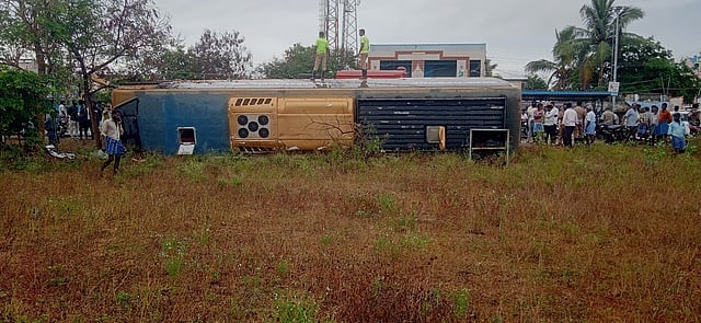 செஞ்சி: விழுப்புரம் மாவட்டம், செஞ்சி அருகே செவ்வாய்க்கிழமை தனியாா் சொகுசுப் பேருந்து கவிழ்ந்து விபத்துக்குள்ளானதில் 10 போ் காயமடைந்தனா்.