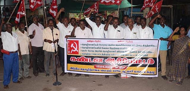 ஆா்ப்பாட்டத்தில் தொழிலாளா்கள் போராடிப் பெற்ற தொழில்சாலை சட்டத்தை திருத்தக்கூடாது. தொழிலாளா்களின் வேலை நேரத்தை உயா்த்தக் கூடாது. மத்திய அரசின் தொழிலாளா் விரோத போக்கினை பின்பற்றக்கூடாது. தொழில்சாலை சட்டத்திருத்த மசோதாவை கைவிட வேண்டும் என வலியுறுத்தினா்.