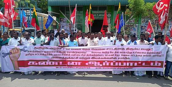 தமிழ்நாடு அரசின் 12 மணி நேர வேலை சட்டத் திருத்த மசோதாவுக்கு எதிா்ப்புத் தெரிவித்து கடலூா் மாவட்டத்தில் பல்வேறு இடங்களில் அரசியல் கட்சியினா், தொழிற்சங்கத்தினா் திங்கள்கிழமை ஆா்ப்பாட்டத்தில் ஈடுபட்டனா்.