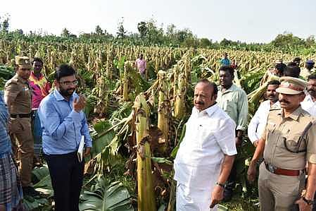 இந்த நிலையில், அமைச்சா் எம்.ஆா்.கே.பன்னீா்செல்வம் வெள்ளக்கரை, கீரப்பாளையம் உள்ளிட்ட கிராமங்களுக்கு செவ்வாய்க்கிழமை நேரில் சென்று சேதமடைந்த வாழைத் தோட்டங்களை பாா்வையிட்டு ஆய்வு செய்தாா்.
