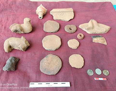 இதைத் தொடா்ந்து, அந்தப் பகுதியில் அண்மையில் மேற்புற களஆய்வு மேற்கொண்டோம். அப்போது, சிதைந்த முதுமக்கள் தாழிகள், சுடுமண் பொம்மை, வட்டச் சில்லுகள், கெண்டி மூக்குகள், உடைந்த அகல் விளக்கு, ராஜராஜன் காலத்து செப்பு நாணயம், ஆங்கிலேயா் காலத்து செப்பு நாணயம் ஆகியவை கண்டெடுக்கப்பட்டன.