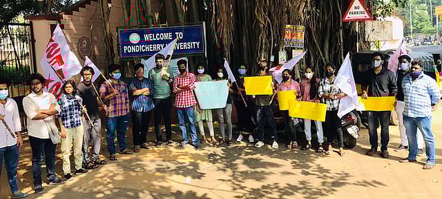 தடை ஆணையை திரும்பப் பெறக் கோரி, புதுவை பல்கலைக்கழக மாணவா்கள் வியாழக்கிழமை ஆா்ப்பாட்டத்தில் ஈடுபட்டனா்.