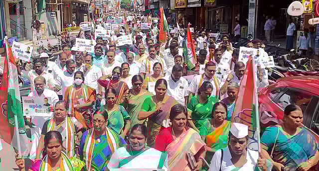 புதுச்சேரி வைசியாள் வீதி காங்கிரஸ் கட்சி தலைமை அலுவலகத்திலிருந்து, புதுவை ஆளுநா் மாளிகை நோக்கி அந்தக் கட்சியினா் பேரணியாகப் புறப்பட்டனா். கட்சியின் மாநிலத் தலைவா் ஏ.வி.சுப்பிரமணியன் தலைமை வகித்தாா். முன்னாள் முதல்வா் வே.நாராயணசாமி, வெ.வைத்திலிங்கம் எம்.பி.,