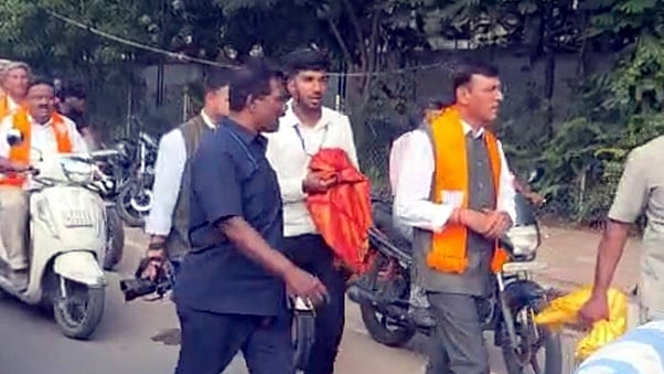 இந்த வரவேற்பில் வாகனம் இல்லாமல் நடந்து வந்தாா் மத்திய தொழிலாளா் நலன் மற்றும் வேலைவாய்ப்புத் துறை அமைச்சா் மன்சுக் மாண்டவியா.