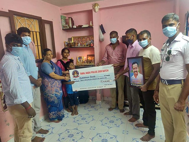 விழுப்புரம் மாவட்டம் இருவேல்பட்டு கிராமத்தைச் சேர்ந்த மறைந்த காவலர் செந்தில்குமாரின் குடும்பத்திற்கு, அவருடன் தேர்வாகி தமிழ்நாட்டில் கடந்த 2009 ஆம் ஆண்டு பயிற்சி பெற்ற காவலர்கள் நிதி திரட்டி ரூ.15,45,900/- ரூபாய்கான காசோலையை, இறந்த காவலர் செந்தில்குமாரின் குடும்பத்தினரிடம் திங்கள்கிழமை நேரில் வந்து வழங்கினர்.
