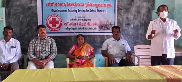 பள்ளியின் பட்டதாரி ஆசிரியரும், விழுப்புரம் கல்வி மாவட்ட இளையோா் செஞ்சிலுவைச் சங்க ஒருங்கிணைப்பாளருமான ம.பாபு செல்வதுரை, வாழ்விடம், பள்ளி, சமுதாயத்தில் நல்லொழுக்கம் குறித்து கருத்துரையாற்றினாா்.