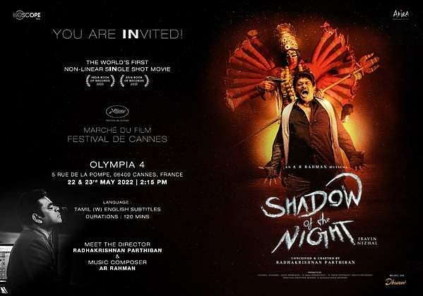 பார்த்திபன் இயக்கத்தில் ஒரே ஷாட்டில் நான் லீனியராக எடுக்கப்பட்ட படம் இரவின் நிழல் இன்று மாலை கேன்ஸ் திரைப்பட விழாவில் திரையிடப்படுகிறது.