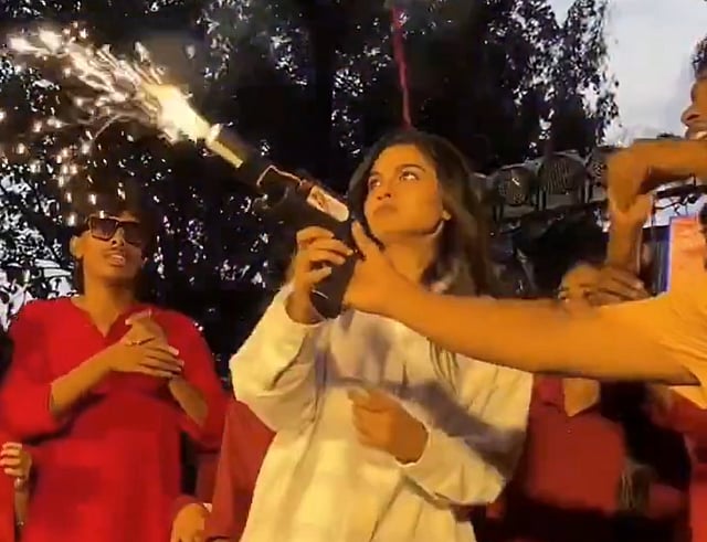 இந்த நிலையில் கேரளத்தில் விளம்பர நிகழ்ச்சியின் போது ரசிகர்களை மகிழ்விக்க நடிகை மமிதா பைஜு ஃபயர் கன்னை பயன்படுத்தி கொண்டாடத்தில் ஈடுபட்டார். ஆரம்பத்தில் ஃபயர் கன்னை ஒருவித பயத்துடன் மற்றொருவர் கையில் இருந்து வாங்கிய அவர் மேலே தூக்கிப் பிடித்து மகிழ்ந்தார்.