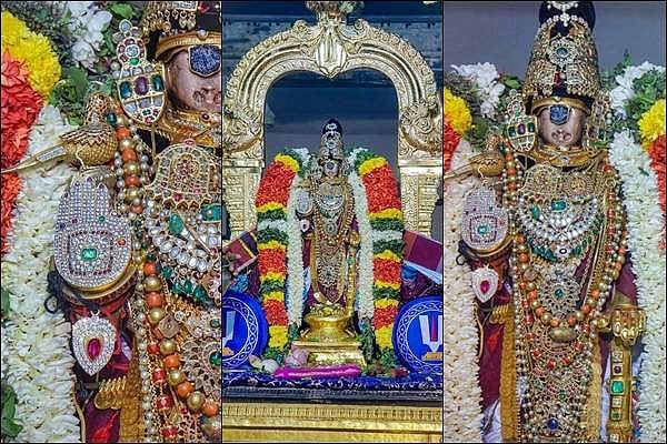 ஸ்ரீரங்கம் ரங்கநாதர் ஆலய வைகுண்ட ஏகாதசி திருவிழா பகல் பத்து 6-ஆம் நாள் நேற்று அனுசரிக்கப்பட்டது. 2020 ஆங்கிலப் புத்தாண்டு நாளான இன்று நம்பெருமாள் புஜகீர்த்தி சவுரி கொண்டை, வைர அபய ஹஸ்தம், லட்சுமி பதக்கம், கையில் தங்க கிளி, முத்துச்சரம், பவள மாலை, காசு மாலை ஆகிய திரு ஆபரணங்களுடன் அர்ச்சுன மண்டபத்தில் பக்தர்களுக்கு அருள் பாலித்தார்.
