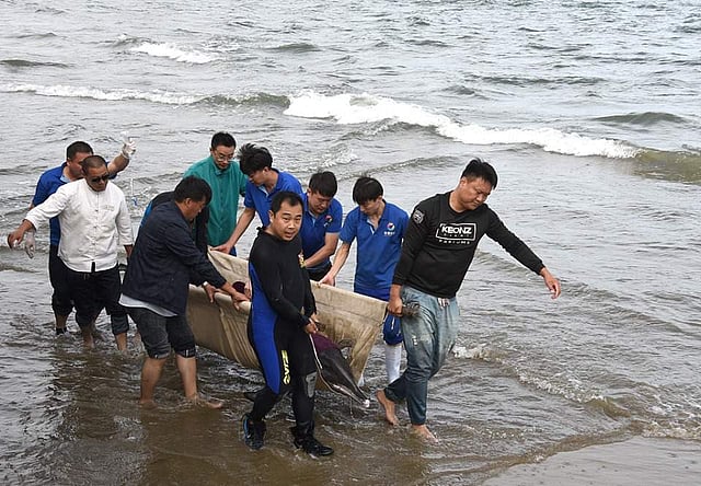 சீனாவின் ஷான்தொங் மாநிலத்தின் வெய்ஹாய் நகரிலுள்ள காயமுற்ற ஒரு டால்பின் மீட்கப்பட்டது