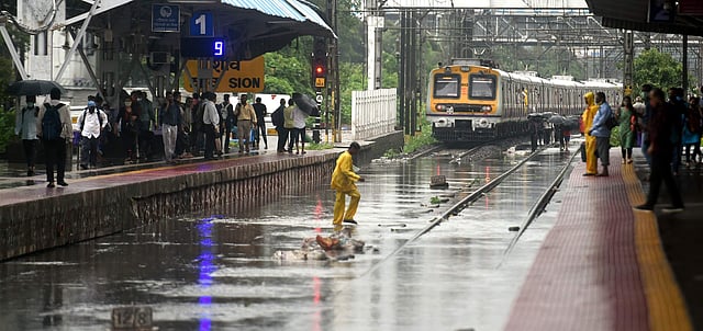 மும்பையில் கனமழை காரணமாக தண்டவாளங்களிலும் மழைநீர் தேங்கி வெள்ளம்போல காட்சியளிப்பதால் ரயில் போக்குவரத்து பாதிப்புக்குள்ளானது..