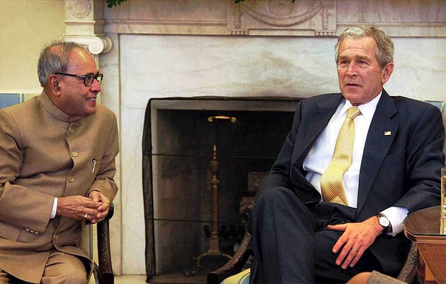 வெள்ளை மாளிகையில் ஜார்ஜ் டபிள்யூ புஷ்ஷுடன் பிரணாப் முகர்ஜி (வெளியுறவுத் துறை அமைச்சராக)