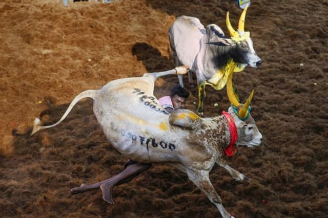 பொங்கல் பண்டிகையை முன்னிட்டு மதுரையில் நடைபெற்ற ஜல்லிக்கட்டுப் போட்டி