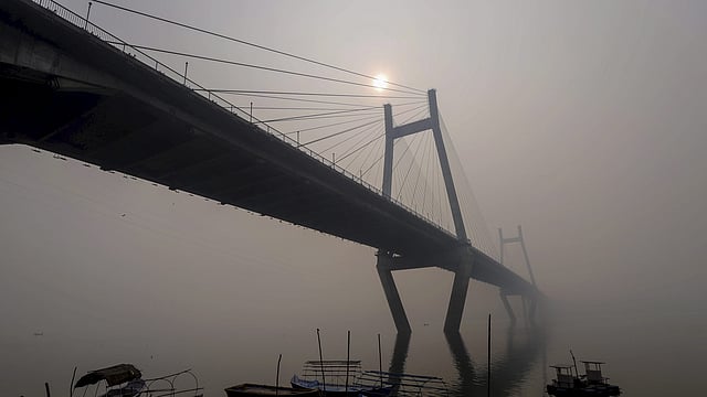 அதிகாலை வேளையில் யமுனை ஆற்றின் மீதுள்ள பாலத்தை சூழ்ந்த அடர்பனி மூட்டம்.