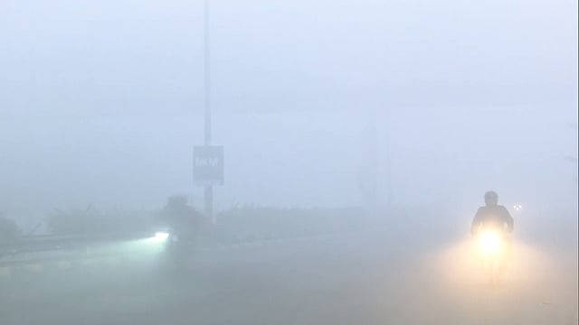 தில்லியில் குளிர்காலம் காரணமாக அடர்ந்த புகை மூட்டம் சூழ்ந்துள்ள நிலையிலும், காற்றின் தரம் மிகவும் மோசம் என்ற அபாய நிலைக்குக் சென்றுள்ளதால், பார்வைத் திறன் குறைந்து, போக்குவரத்து பாதிக்கப்பட்டு, தில்லி-நொய்டா-தில்லி மேம்பாலத்தில் ஊர்ந்து பயணிக்கும் வாகனங்கள். ANI