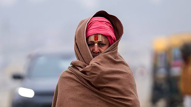 பிரயாக்ராஜ் திரிவேணி சங்கமத்தில், குளிர்கால காலைப்பொழுதில் தன்னை கதகதப்பான வைத்துகொள்ள ஆடைகளால் போர்த்திக்கொண்டு வரும் பக்தர் ஒருவர்.