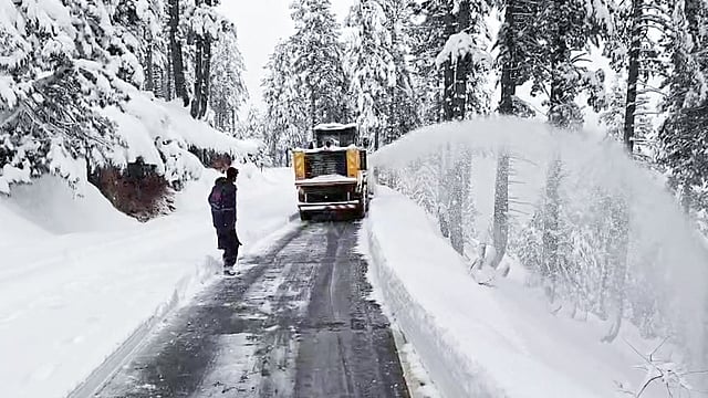 பனி பொழிவின் காரணமாக வெள்ளை போர்வை போர்த்திய சொர்க்கமாக காணப்படும் குப்வாராவில், வாகனங்கள் செல்ல ஏதுவாக பனியை அகற்றி வரும் எல்லை சாலை அமைப்பினர். ANI