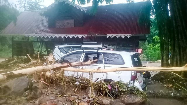 மேற்கு வங்கத்தின் வடக்கு பகுதியிலுள்ள டார்ஜிலிங் மாவட்டத்தில், பெய்த கனமழையால் ஏற்பட்ட நிலச்சரிவில் சிக்கிய வாகனங்கள். -