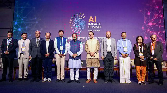 புதுதில்லி பாரத் மண்டபத்தில் நடைபெற்று வரும் ஏ.ஐ. உச்சி மாநாடு 2026ல் மத்திய கல்வி அமைச்சர் தர்மேந்திர பிரதான், இணையமைச்சர் ஜெயந்த் செளத்ரி மற்றும் தொழில்நுட்ப வல்லுநர்கள். ANI