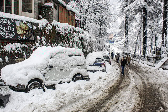 மணாலியில், புதிதாகப் பெய்த பனிப்பொழிவுக்குப் பிறகு பனியால் மூடப்பட்ட வாகனங்கள். HA