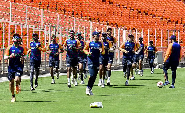 ஆமதாபாத்தில் உள்ள சர்தார் படேல் குஜராத் மைதானத்தில் பயிற்சியில் ஈடுபட்ட இந்திய வீரர்கள்.
