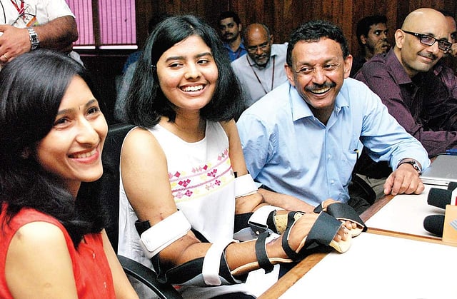 ஷ்ரேயா சித்தனகௌடா (19) என்ற மணிப்பால் தொழில்நுட்பக் கல்லூரி மாணவி, கடந்த ஆண்டு நிகழ்ந்த சாலை விபத்து ஒன்றில் இரண்டு கைகளையும் இழந்தார்.