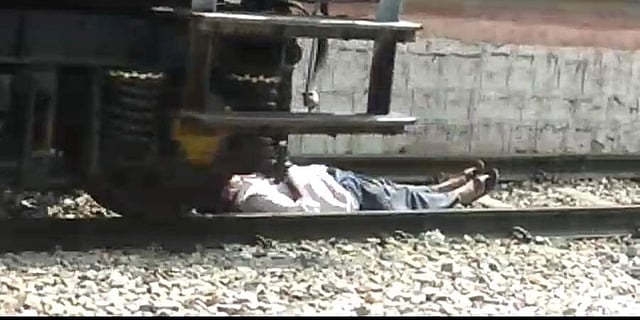 ஆனால், ரயில் மிக அருகில் வந்ததைப் பார்த்த அந்த நபர், சாதுர்யமாக காலை நீட்டி தண்டவாளத்தில் படுத்தே விட்டார். அவர் மீது சரக்கு ரயில் வேகமாக கடந்து சென்றது. ரயில் முழுவதுமாக தன்னைக் கடந்து சென்ற பிறகு தூங்கி எழுந்தது போல கை கால்களை அசைத்தபடி எழுந்து நின்றார்.