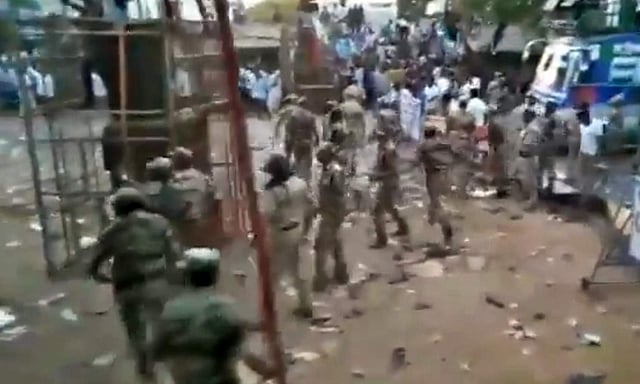 இதையடுத்து பாதுகாப்புப் பணியில் ஈடுபட்டிருந்த போலீஸார் தடியடி நடத்தி கூட்டத்தை கலைத்தனர். இந்த விடியோ சமூக வலைதளங்களில் வைரலாகப் பரவி பெரும் பரபரப்பை ஏற்படுத்தி வருகிறது.