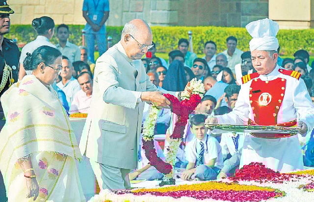மகாத்மா காந்தியின் 150ஆவது பிறந்த தினத்தை ஒட்டி புதன்கிழமை தில்லியில் ராஜ்காட்டில் உள்ள அவரது நினைவிடத்தில் குடியரசுத் தலைவா் ராம்நாத் கோவிந்த், குடியரசுத் துணைத் தலைவா் எம். வெங்கய்ய நாயுடு, பிரதமா் நரேந்திர மோடி உள்ளிட்டோா் மரியாதை செய்தனா்.