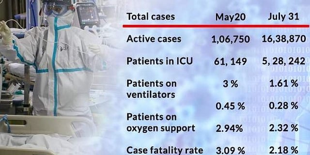 அதே சமயம் ஜூலை 31-ம் தேதி நாட்டில் 5.28 லட்சம் கரோனா நோயாளிகள் இருந்த போது 8,504 (1.61%) பேர் தீவிர சிகிச்சைப் பிரிவில் அனுமதிக்கப்பட்டனர். 1580 (0.28%) நோயாளிகளுக்கு வென்டிலேட்டர் வசதியும், 12,255 (2.3%) நோயாளிகளுக்கு ஆக்ஸிஜன் உதவியும் தேவைப்பட்டது.