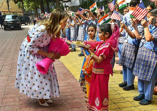 இந்தியா வந்துள்ள அமெரிக்க அதிபர் டொனால்ட் டிரம்ப்பின் மனைவி மெலானியா தில்லியில் உள்ள அரசுப் பள்ளிக்கு வருகை தந்தார். அவருக்கு மாணவ, மாணவிகள் அழகான அலங்கார ஆடைகளுடன் சிறப்பான வரவேற்பினை அளித்தனர்.