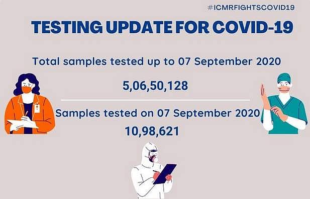 நாட்டில் கரோனா பரிசோதனை குறித்து செவ்வாய்க்கிழமை காலை வெளியிட்ட புள்ளி விவரத்தின் அடிப்படையில், செப்டம்பர் 7-ம் தேதி வரை நாட்டில் ஒட்டுமொத்தமாக 5,06,50,128 கரோனா பரிசோதனைகள் மேற்கொள்ளப்பட்டுள்ளன. நேற்று ஒரே நாளில் 10,98,621 மாதிரிகள் கரோனா பரிசோதனைக்கு உள்படுத்தப்பட்டுள்ளது என்று தெரிவிக்கப்பட்டுள்ளது.