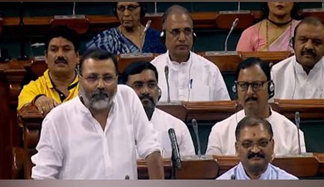 அடுத்து பேசுவதற்கு ஜார்க்கண்ட் மாநில பாஜக எம்.பி. நிஷிகாந்த் துபே அழைக்கப்பட்டார். அவர் பேசும் போது கட்சி எம்.பி.க்கள் அமளியில் ஈடுபட்டனர். சற்று நேரம் அமளி குறைந்ததும், மீண்டும் அவர் பேசத் தொடங்கியதுபோது, அவரது பேச்சுக்கு எதிர்ப்பு தெரிவித்து பாஜக உள்ளிட்ட எதிர்க்கட்சி எம்.பி.க்கள் எதிர்ப்பு தெரிவித்து கோஷமெழுப்பினர்.