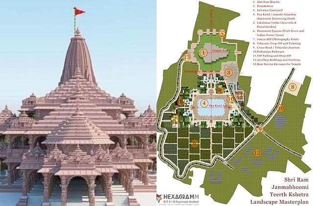 வரைபடத்தில், ராமர் கோயில் வளாகம் 70 ஏக்கர் பரப்பளவில் அமையவுள்ளது. அதில், 70 சதவிகிதம் பசுமையாக உள்ளது. இதனால், பெரும்பகுதி தோட்டங்களாகவும், நந்தவனங்களாகவும் பராமரிக்கப்படவுள்ளது.