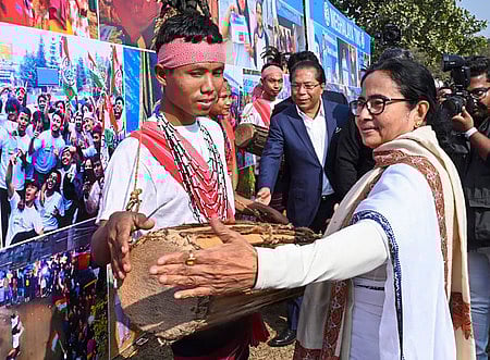 மேகாலயத்தில் புதன்கிழமை பொதுக் கூட்டத்தில் பங்கேற்றபோது இசைக் கருவியை இசைத்த மேற்கு வங்க முதல்வா்மம்தா பானா்ஜி.