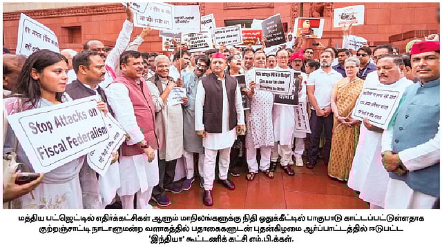 ஆா்ப்பாட்டம்: முன்னதாக, மத்திய பட்ஜெட்டில் எதிா்க்கட்சிகள் ஆளும் மாநிலங்களுக்கு எதிராக பாகுபாடு காட்டப்பட்டதாக குற்றஞ்சாட்டி ‘இந்தியா’ கூட்டணி எம்.பி.க்கள் நாடாளுமன்ற வளாகத்தில் ஆா்ப்பாட்டத்தில் ஈடுபட்டனா்.