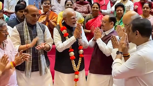 பாதுகாப்புத் துறை அமைச்சர் ராஜ்நாத் சிங், மோடிக்கு மாலை அணிவித்தபோது, எம்பிக்கள் அனைவரும் ஹர ஹர மகாதேவ் என்று முழக்கம் எழுப்பினர்.